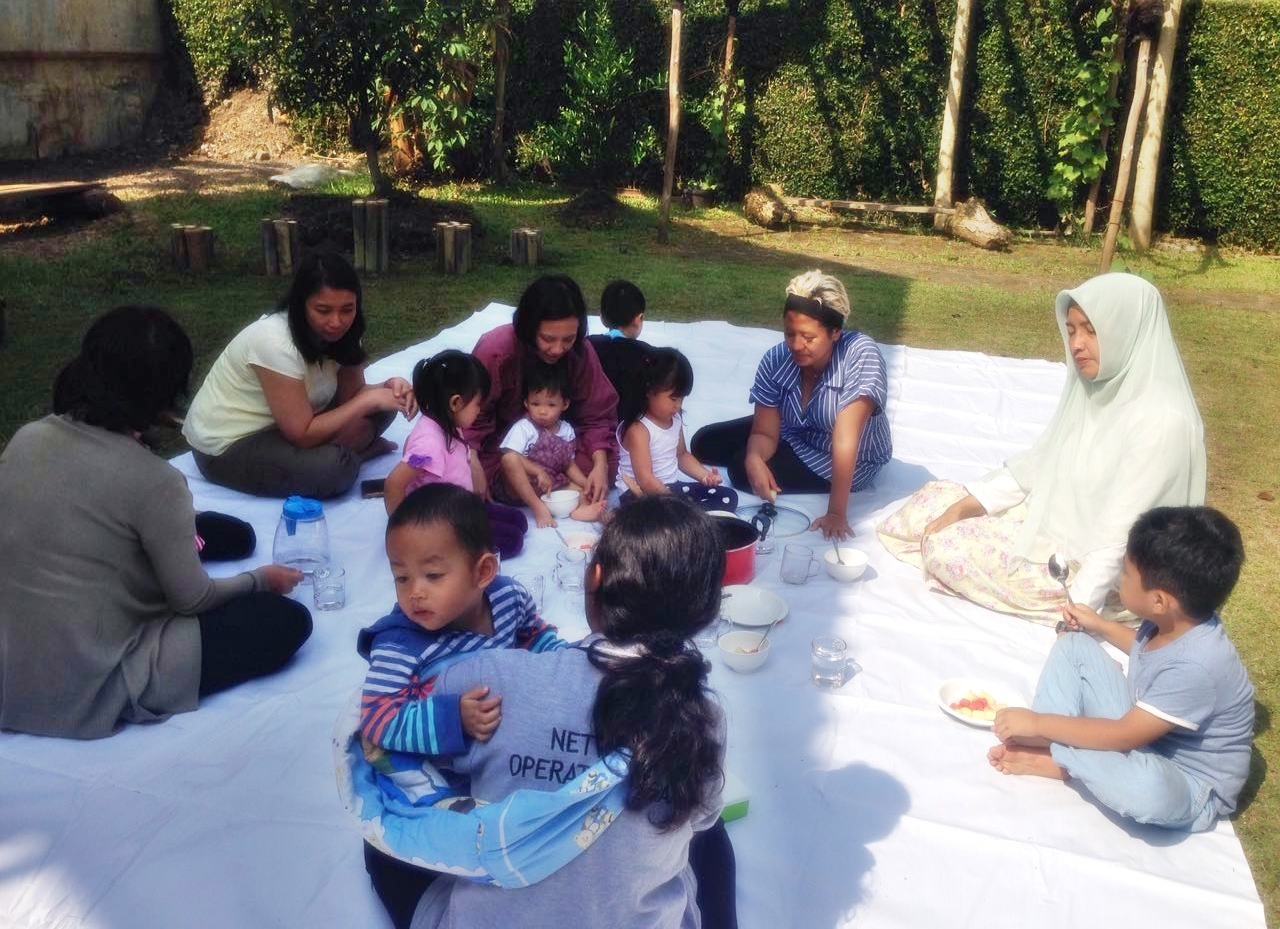 Snack yang dibuat bersama guru dan anak-anak telah siap. Anak-anak menunggu snack dibagikan, tidak lupa berucap syukur kepada alam semesta dan pencipta yang telah memberikan makanan dan minuman untuk dinikmati bersama.
